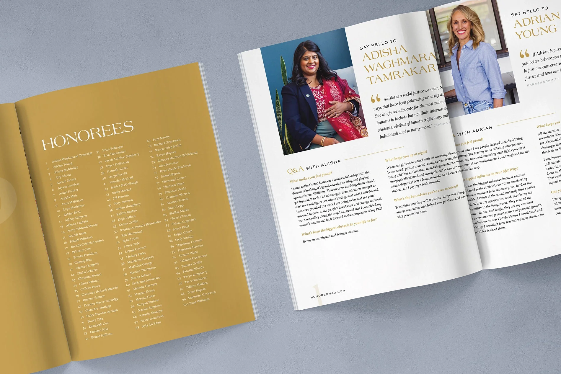 Beginning with Issue 03, Toast has led the design and creative direction for Hundred Magazine. Our primary goal was to strengthen visual hierarchy while elevating the narrative flow of each interview. Opening nominator quotes were treated as visual anchors, establishing an emotional entry point for every profile, while the Q&A format allowed each story to unfold in an authentic, conversational way. Subtle layout variations helped distinguish individual profiles while maintaining a cohesive editorial voice throughout the publication.